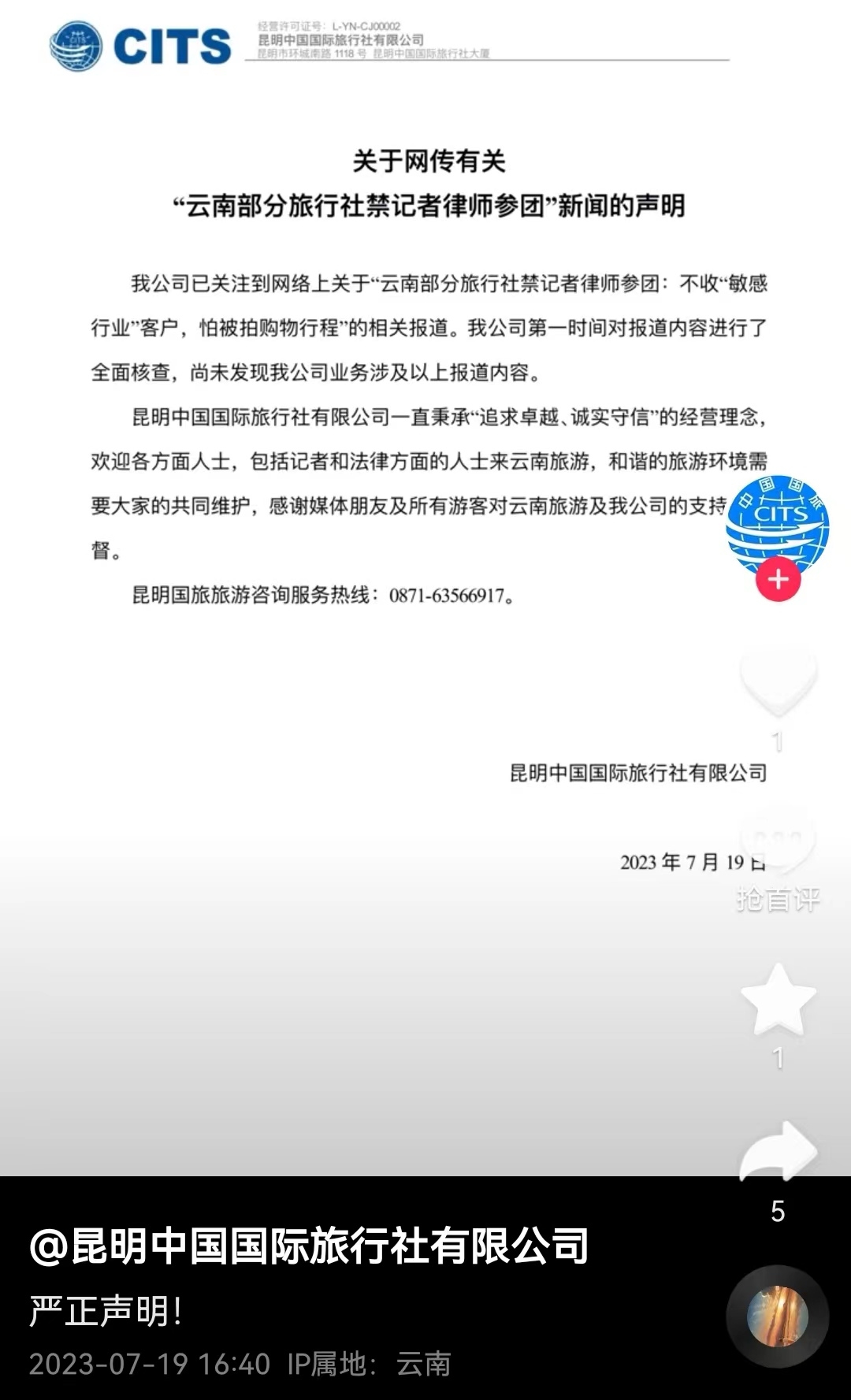 19日,昆明中國(guó)國(guó)際旅行社有限公司發(fā)布相關(guān)聲明,稱公司已關(guān)注到網(wǎng)絡(luò)上關(guān)于“云南部分旅行社禁記者律師參團(tuán):不收‘敏感行業(yè)’客戶,怕被拍購(gòu)物行程”的相關(guān)報(bào)道,第一時(shí)間對(duì)報(bào)道內(nèi)容進(jìn)行了全面核查,尚未發(fā)現(xiàn)公司業(yè)務(wù)涉及以上報(bào)道內(nèi)容。