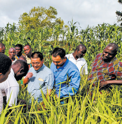 中國(guó)中化控股有限責(zé)任公司旗下荃銀高科的水稻專家在多哥示范田現(xiàn)場(chǎng),為當(dāng)?shù)剞r(nóng)民講解水稻抽穗揚(yáng)花期的關(guān)鍵技術(shù)和田間管理要點(diǎn)。