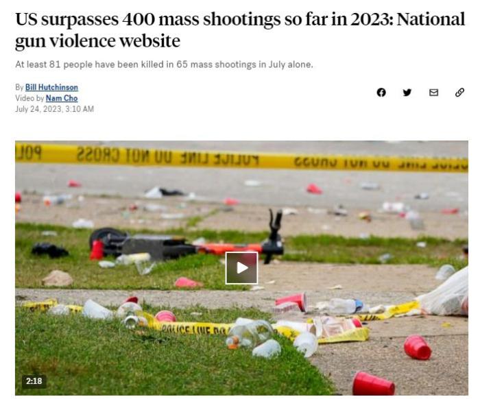 中新網(wǎng)7月24日電 據(jù)美國(guó)廣播公司(ABC)24日?qǐng)?bào)道,美國(guó)“槍支暴力檔案”的數(shù)據(jù)顯示,在2023年,美國(guó)已發(fā)生超過(guò)400起大規(guī)模槍擊事件。該網(wǎng)站將大規(guī)模槍擊事件定義為造成4人或4人以上傷亡的單一事件。