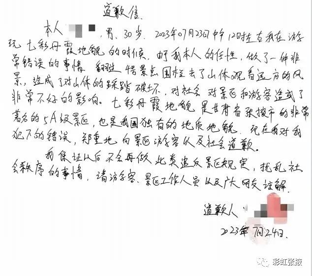通報(bào)表示,該游客進(jìn)入?yún)^(qū)域是張掖世界地質(zhì)公園彩色丘陵保護(hù)范圍,雖然因其行走的山脊被黃土覆蓋,未造成實(shí)質(zhì)性損害,但其行為違反了《張掖七彩丹霞保護(hù)條例》和《治安管理處罰法》相關(guān)規(guī)定。7月24日16:50該游客從旅游途中返回臨澤縣,接受相關(guān)部門調(diào)查處理。市、縣林草部門對該游客進(jìn)行了嚴(yán)肅的批評教育;丹霞景區(qū)派出所依據(jù)《治安管理處罰法》對該游客處以200元罰款;該游客深刻認(rèn)識到自身行為的錯(cuò)誤性和嚴(yán)重性,并公開致歉。