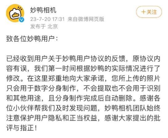 對此,妙鴨相機(jī)在7月20日回應(yīng)稱,原協(xié)議內(nèi)容有誤,并第一時(shí)間刪除了相關(guān)條款。