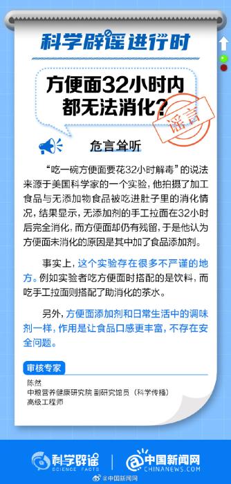 中新網(wǎng)8月1日電 “吃一碗方便面要花32小時(shí)解毒”的說(shuō)法來(lái)源于美國(guó)科學(xué)家的一個(gè)實(shí)驗(yàn),但這個(gè)實(shí)驗(yàn)存在很多不嚴(yán)謹(jǐn)?shù)牡胤?。方便面添加劑和日常生活中的調(diào)味劑一樣,作用是讓食品口感更豐富,不存在安全問(wèn)題。(來(lái)源:@科學(xué)辟謠 @中國(guó)新聞網(wǎng) )
