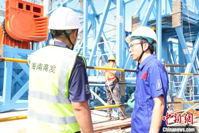 圖為首俊明在海南商業(yè)航天發(fā)射場1號工位向工人了解項目建設進展。符宇群攝