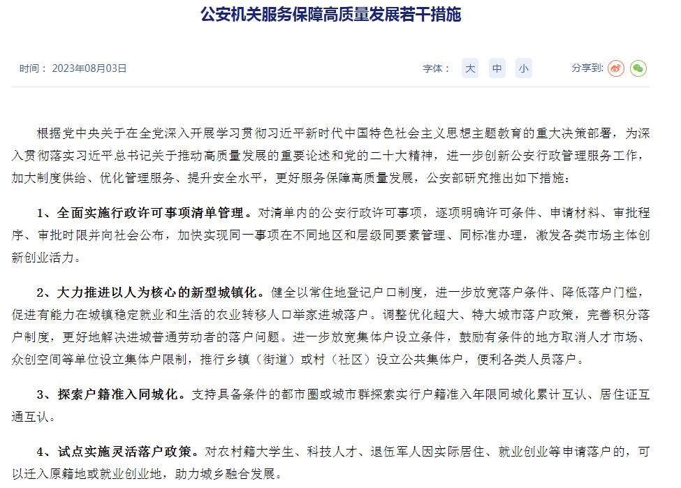 8月3日,公安部發(fā)布公安機(jī)關(guān)服務(wù)保障高質(zhì)量發(fā)展若干措施,其中在戶(hù)籍政策方面提出一系列舉措。