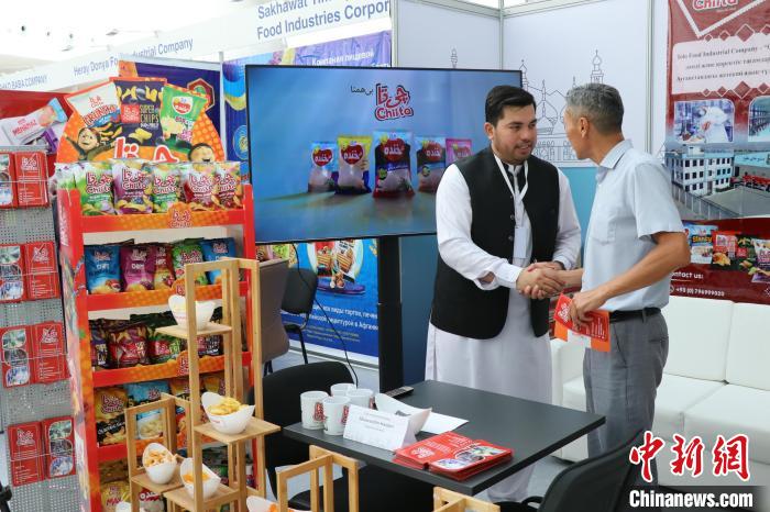 當(dāng)?shù)貢r(shí)間8月3日,哈薩克斯坦阿斯塔納,阿富汗商品展當(dāng)日啟幕。圖為阿富汗食品展商與哈顧客洽談。 中新網(wǎng)記者 張碩 攝