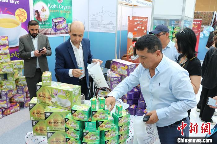 當(dāng)?shù)貢r(shí)間8月3日,哈薩克斯坦阿斯塔納,阿富汗商品展當(dāng)日啟幕。圖為阿富汗茶葉展位吸引當(dāng)?shù)仡櫩婉v足?! ≈行戮W(wǎng)記者 張碩 攝