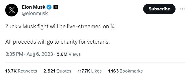 據(jù)報道,當(dāng)天,馬斯克在社交媒體X發(fā)文稱,“扎克伯格與馬斯克之戰(zhàn)將在X上直播。所有收益將捐給退伍軍人慈善機(jī)構(gòu)。”