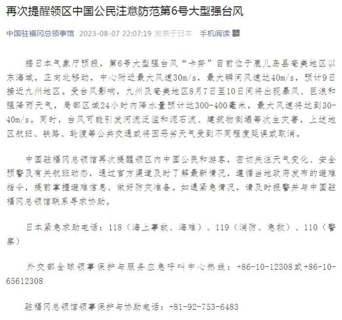 中國駐福岡總領(lǐng)館再次提醒領(lǐng)區(qū)內(nèi)中國公民和游客,密切關(guān)注天氣變化、安全預(yù)警及有關(guān)航班動(dòng)態(tài),通過官方渠道及時(shí)了解最新情況,遵循當(dāng)?shù)卣l(fā)布的避難指令,提前掌握避難信息、做好防災(zāi)準(zhǔn)備。如遇緊急情況,請(qǐng)及時(shí)報(bào)警并與中國駐福岡總領(lǐng)館聯(lián)系尋求協(xié)助。