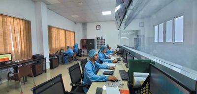 在安琪酵母(埃及)有限公司抽提物生產(chǎn)部中控室,當?shù)貑T工正在檢查數(shù)據(jù)。