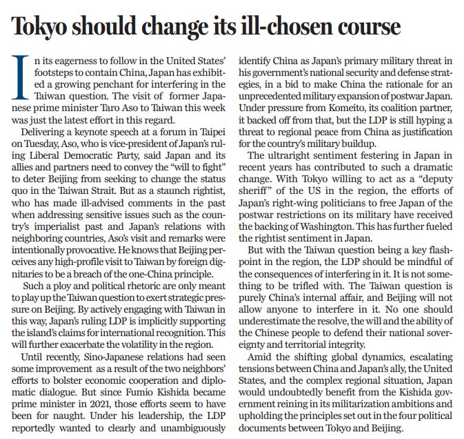 身為日本執(zhí)政的自民黨副總裁,麻生太郎周二在臺發(fā)表演講,口出狂言,大放厥詞,說什么日本及其盟友和伙伴要對外傳達“戰(zhàn)斗意志”。作為頑固的右翼分子,麻生竄臺和上述言論完全是蓄意挑釁。任何外國政要高調(diào)竄臺都違反一個中國原則,都是對中國內(nèi)政的粗暴干涉。對此,麻生心知肚明,明知故犯,就是為了渲染臺灣問題,向北京施加戰(zhàn)略壓力。通過與臺積極接觸,日方明里暗里支持臺當(dāng)局企圖獲得國際承認的癡心妄想,將進一步加劇地區(qū)動蕩。