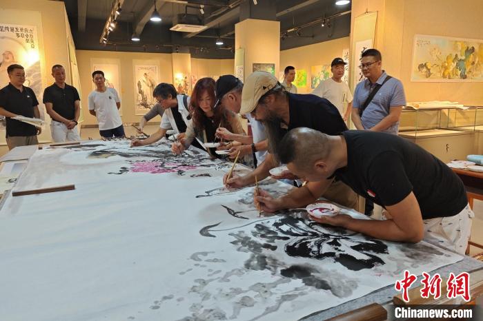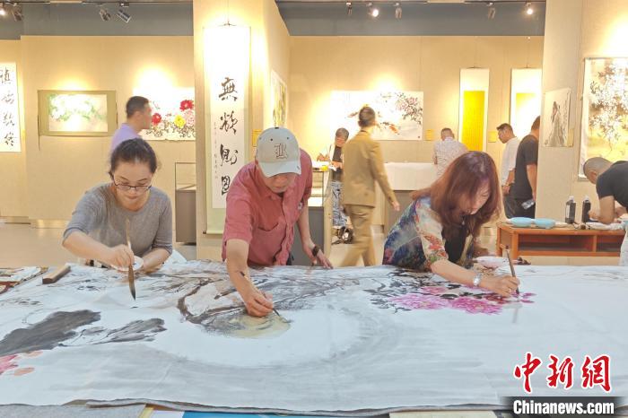 8月9日,張明琴(右一)在福建泉州與藝術家們共繪國畫作品?!枪跇?攝