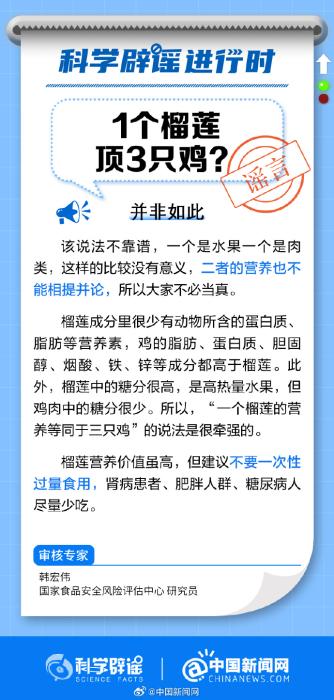 中新網(wǎng)8月15日電 1個(gè)榴蓮頂3只雞?該說(shuō)法不靠譜,一個(gè)是水果一個(gè)是肉類(lèi),這樣的比較沒(méi)有意義,二者的營(yíng)養(yǎng)也不能相提并論。雖然榴蓮營(yíng)養(yǎng)價(jià)值高,但還是建議不要一次性過(guò)量食用,腎病患者、肥胖人群、糖尿病人盡量少吃。(來(lái)源:@科學(xué)辟謠 @中國(guó)新聞網(wǎng) )