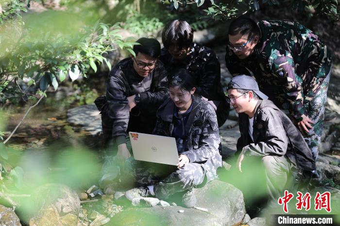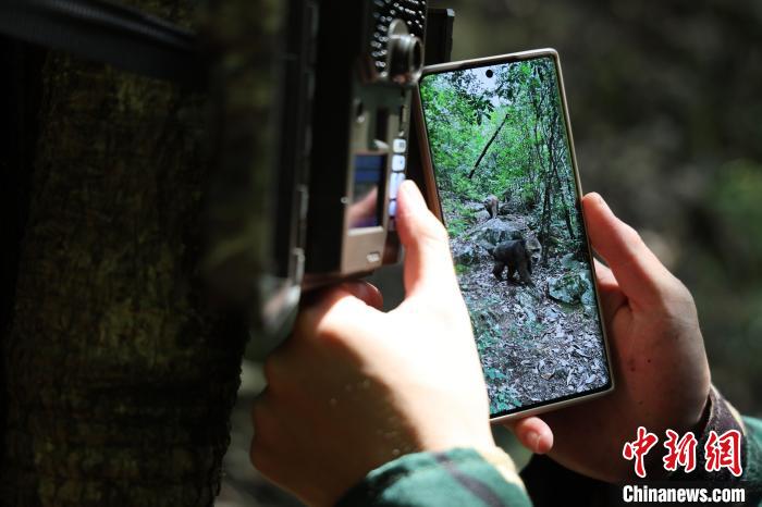 安徽大學(xué)研究團隊在安徽省黃山市湯口鎮(zhèn)浮溪村——黃山野生猴谷檢查監(jiān)控視頻。樊成柱 攝