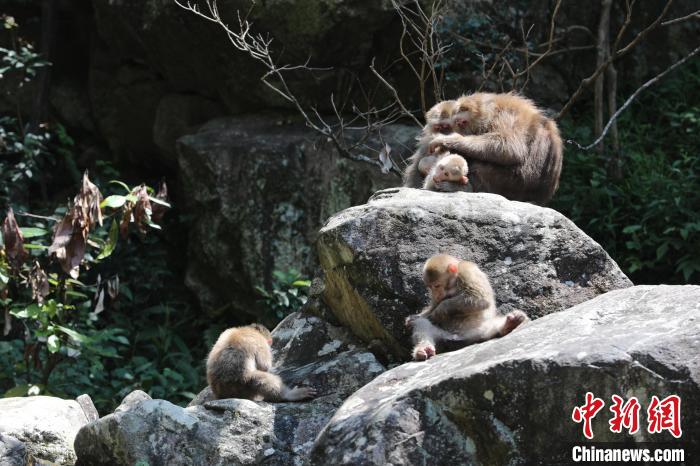 當天,在黃山市浮溪短尾猴野外研究觀測基地內(nèi),成群結(jié)隊的黃山短尾猴或在小河溝、小溪邊翻石扒枯枝爛葉尋找食物,又或依偎在石壁上曬太陽,還有的在松石和護欄間嬉戲,賣萌調(diào)皮的樣子讓人難以忘懷。
