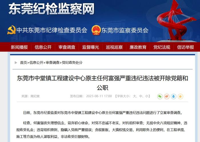 按照東莞市紀(jì)委監(jiān)委的通報,何富強(qiáng)喪失理想信念,背棄初心使命,對黨不忠誠不老實,對抗組織審查;無視中央八項規(guī)定精神,違規(guī)收受禮金;違背組織原則,隱瞞入黨前嚴(yán)重錯誤;貪欲膨脹,大搞權(quán)錢交易,利用職務(wù)上的便利,在工程承攬、施工等方面為他人謀取利益,非法收受巨額財物。