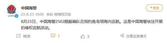中新網(wǎng)8月23日電 據(jù)中國(guó)海警局官方微博消息,8月23日,中國(guó)海警2502艦艇編隊(duì)在中國(guó)釣魚島領(lǐng)海內(nèi)巡航。這是中國(guó)海警依法開展的維權(quán)巡航活動(dòng)。