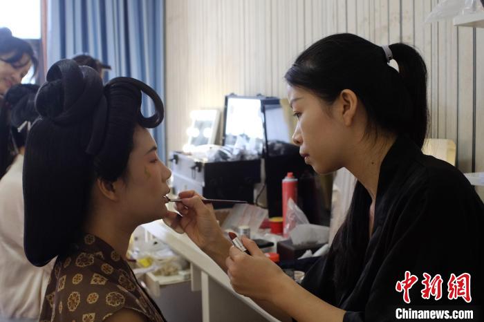 8月20日,廣西柳州,古典妝造師覃麗華正忙著給選手們化妝,完成整套造型需花費(fèi)數(shù)小時(shí)。中新社記者 劉俊聰 攝