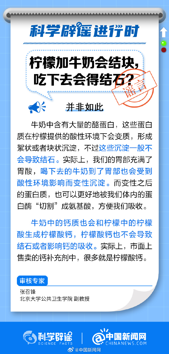 中新網(wǎng)8月29日電 牛奶中含有大量的酪蛋白,這些蛋白質(zhì)在檸檬提供的酸性環(huán)境下會變質(zhì),形成絮狀或者塊狀沉淀,不過這些沉淀一般不會導致結(jié)石。牛奶中的鈣質(zhì)也會和檸檬中的檸檬酸生成檸檬酸鈣,檸檬酸鈣也不會導致結(jié)石或者影響鈣的吸收。(來源:@科學辟謠 中國新聞網(wǎng)微博)