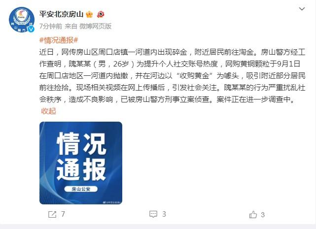 中新網(wǎng)9月3日電 3日,北京市公安局房山分局官方微博發(fā)布情況通報(bào)稱,近日,網(wǎng)傳房山區(qū)周口店鎮(zhèn)一河道內(nèi)出現(xiàn)碎金,附近居民前往淘金。房山警方經(jīng)工作查明,隗某某(男,26歲)為提升個(gè)人社交賬號(hào)熱度,網(wǎng)購黃銅顆粒于9月1日在周口店地區(qū)一河道內(nèi)拋撒,并在河邊以“收購黃金”為噱頭,吸引附近部分居民前往撿拾。現(xiàn)場(chǎng)相關(guān)視頻在網(wǎng)上傳播后,引發(fā)社會(huì)關(guān)注。隗某某的行為嚴(yán)重?cái)_亂社會(huì)秩序,造成不良影響,已被房山警方刑事立案?jìng)刹?。案件正在進(jìn)一步調(diào)查中。