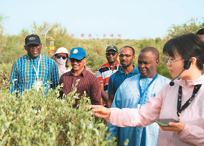近日,來自非洲的專家在中國新疆參加中非治沙培訓(xùn)班。圖為在塔克拉瑪干沙漠腹地塔中植物園,中方技術(shù)人員向非洲學(xué)員介紹荒漠植物。