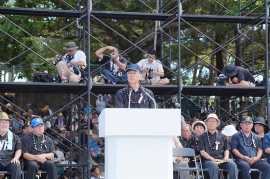 2016年6月19日,在日本沖繩縣首府那霸市一座公園內(nèi),時(shí)任沖繩縣知事翁長雄志(前)發(fā)表講話。新華社記者沈紅輝攝