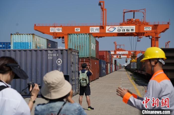 5日,“走進(jìn)壯美廣西·探尋向海之美”兩岸媒體人聯(lián)合采訪活動(dòng)來到位于廣西欽州的欽州鐵路集裝箱中心站和北部灣港欽州自動(dòng)化集裝箱碼頭。作為西部陸海新通道的重要節(jié)點(diǎn),欽州的樞紐通道優(yōu)勢(shì)越發(fā)凸顯。在鐵海聯(lián)運(yùn)新模式下,來自泰國(guó)、新加坡等“一帶一路”沿線國(guó)家和中國(guó)西部地區(qū)的貨物在這里實(shí)現(xiàn)“下船即上車,下車即上船”。
