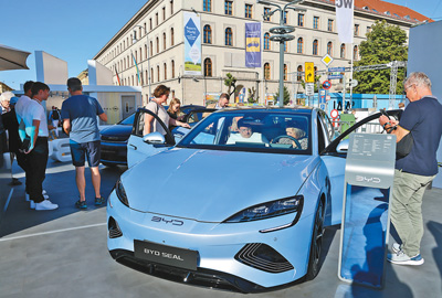 位于慕尼黑市中心的城市公共展示區(qū),不少觀眾參觀體驗(yàn)比亞迪電動(dòng)汽車。