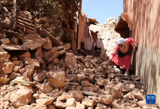 9月11日,在摩洛哥馬拉喀什南部的穆萊村,一名婦女走過(guò)地震廢墟。新華社記者王東震攝