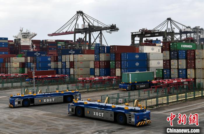 9月7日,廈門遠(yuǎn)海自動(dòng)化碼頭上,轉(zhuǎn)運(yùn)集裝箱的自動(dòng)導(dǎo)引車正在作業(yè)。這是全球首個(gè)第四代自動(dòng)化碼頭、中國(guó)首個(gè)擁有全部自主知識(shí)產(chǎn)權(quán)的自動(dòng)化碼頭,開行了多條“絲路海運(yùn)”命名航線。 中新社記者 張斌 攝