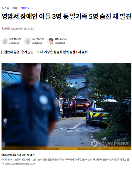 中新網(wǎng)9月15日電 據(jù)韓聯(lián)社報(bào)道,當(dāng)?shù)貢r(shí)間15日下午,韓國全羅南道靈巖郡一家五口在家中同時(shí)身亡,現(xiàn)場(chǎng)到處都是血跡。