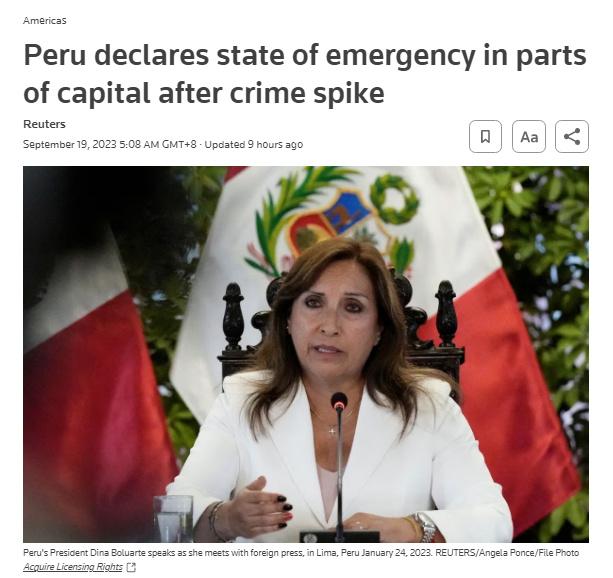 中新網(wǎng)9月19日電 據(jù)路透社報道,當?shù)貢r間18日,秘魯總統(tǒng)博盧阿特表示,秘魯政府已宣布首都利馬市三個犯罪率飆升的地區(qū)進入緊急狀態(tài),這一措施允許軍方協(xié)助政府加強地區(qū)安全管控。