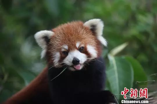 圖為正在采食竹葉的小熊貓嘟嘟吐舌賣萌。鐘欣 攝
