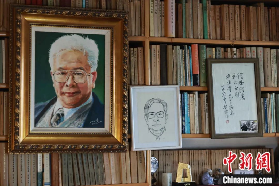 走入方漢奇家中,書(shū)籍的馨香游離在每個(gè)房間。約30平方米的書(shū)房三面環(huán)書(shū),墻上、書(shū)架上陳列著往日和梁漱溟、金庸等大家的合影。落地至天花板的特制書(shū)架分里外兩層,說(shuō)是藏書(shū)萬(wàn)冊(cè)也毫不夸張。一架望遠(yuǎn)鏡,一把折疊梯,供房屋主人調(diào)遣書(shū)架上的千軍萬(wàn)馬。