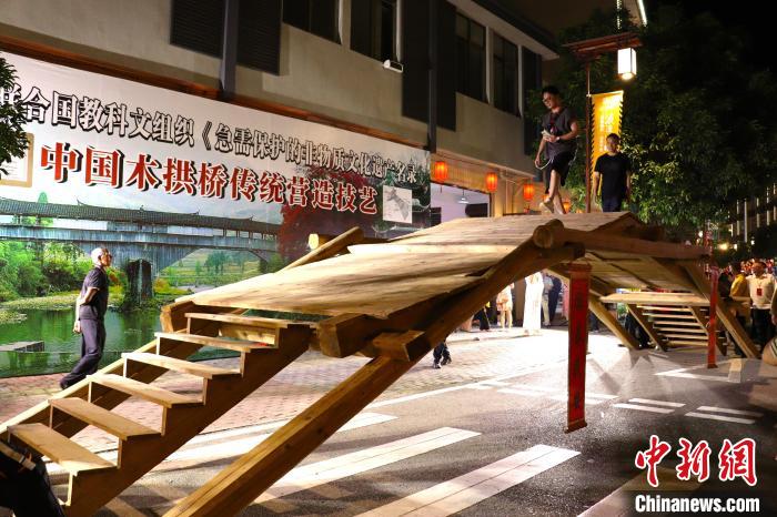 木拱廊橋傳統(tǒng)營造技藝展示現(xiàn)場,游客登橋行走。中新網記者 葉茂 攝