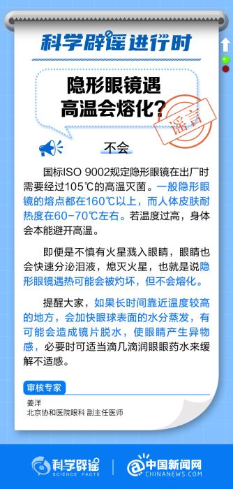 中新網(wǎng)9月20日電 吃火鍋時戴隱形眼鏡會熔化嗎?一般隱形眼鏡的熔點都在160℃以上,而人體皮膚耐熱度在60-70℃左右。若溫度過高,身體會本能避開高溫。即便是不慎有火星濺入眼睛,眼睛也會快速分泌淚液,熄滅火星,也就是說隱形眼鏡遇熱可能會被灼壞,但不會熔化。(來源:@科學辟謠 @中國新聞網(wǎng) )