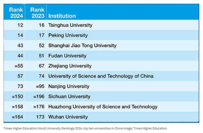 文章注意到,中國(guó)有史以來(lái)首次有兩所大學(xué)躋身世界大學(xué)排名前15。清華大學(xué)(從排名第16升至第12)和北京大學(xué)(從第17升至第14)逐步接近全球前十,超越了賓夕法尼亞大學(xué)、約翰·霍普金斯大學(xué)和哥倫比亞大學(xué)等美國(guó)一流大學(xué)。