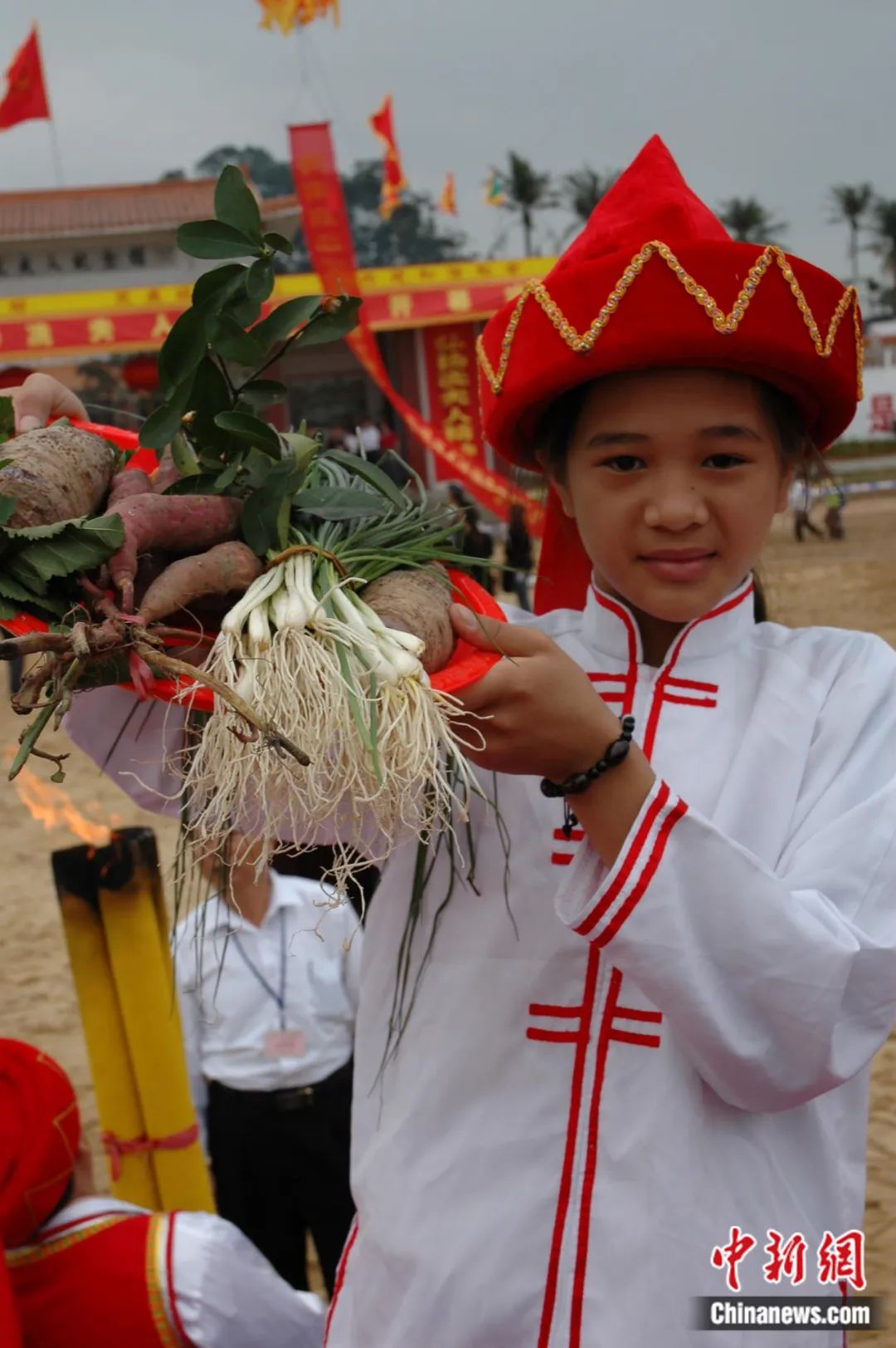 海口小姑娘用春蔥、地瓜和桑桔等農(nóng)家土特產(chǎn)品祭祀“嶺南圣母”冼夫人。王辛莉 攝