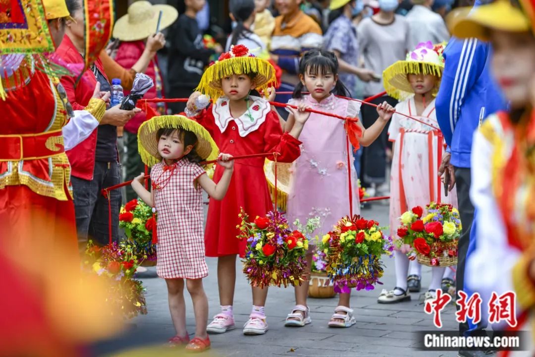 2023年2月28日,第二十二屆??谫蛉宋幕?jié)(原稱軍坡節(jié))之“裝軍巡游”活動(dòng)在海南??谛缕骆?zhèn)舉行。圖為在活動(dòng)中肩挑花籃的小女孩。駱云飛 攝