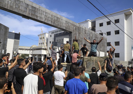 ↑10月7日,在加沙城,巴勒斯坦人登上一輛以色列軍用車(chē)輛。新華社發(fā)(里澤克·阿卜杜勒賈瓦德攝)