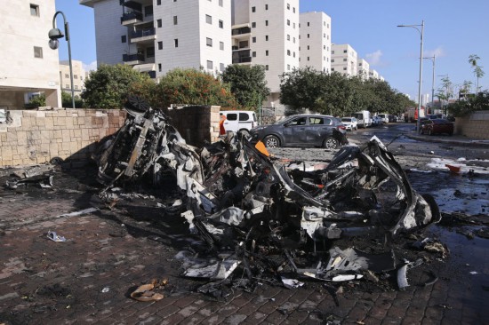 ↑這是10月7日在以色列南部城市阿什克隆拍攝的遭火箭彈破壞的車(chē)輛。新華社發(fā)(伊蘭·阿薩亞格攝/基尼圖片社)