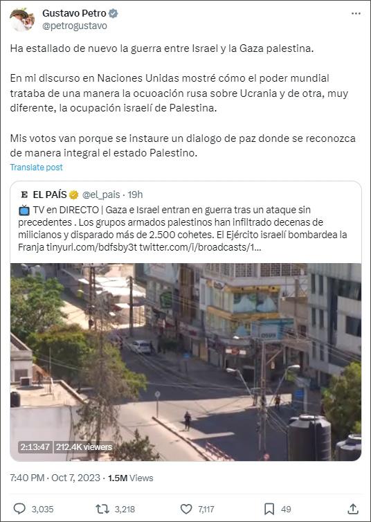 “以色列和巴勒斯坦在加沙地帶再次爆發(fā)戰(zhàn)爭。在聯(lián)合國的演講中,我曾展示了世界大國如何以一種方式對(duì)待俄羅斯對(duì)烏克蘭的占領(lǐng),但又以另一種截然不同的方式對(duì)待以色列對(duì)巴勒斯坦的占領(lǐng)。 ”佩特羅在社交媒體X發(fā)文說,“我支持建立和平對(duì)話,巴勒斯坦國將得到全面承認(rèn)。”