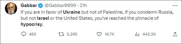 美國合眾國際社(UPI)報(bào)道注意到,有很多媒體專欄作者和社交媒體用戶都指出了西方在俄烏沖突等問題上的“虛偽行為”,佩特羅并不是唯一一位。例如一名認(rèn)證為“作家”的社交媒體用戶寫道:“如果你支持烏克蘭而不支持巴勒斯坦,如果你譴責(zé)俄羅斯卻不譴責(zé)以色列或美國,那么你就已經(jīng)達(dá)到了虛偽的頂峰?!?/p>