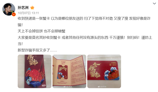 10月7日,演員孫藝洲在微博發(fā)文稱,“收到快遞是一張蟹卡,以為是哪位朋友送的。掃了下覺得不對勁,又搜了搜。發(fā)現(xiàn)好像是詐騙!天上不會掉餡餅,也不會掉螃蟹。大家要是莫名其妙收到蟹卡,或者其他任何沒有源頭的東西,千萬謹慎!別掃碼!謹防上當!新型詐騙手段又多了……”