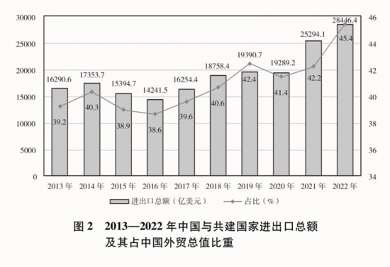 貿(mào)易投資規(guī)模穩(wěn)步擴(kuò)大。2013-2022年,中國(guó)與共建國(guó)家進(jìn)出口總額累計(jì)19.1萬(wàn)億美元,年均增長(zhǎng)6.4%;與共建國(guó)家雙向投資累計(jì)超過3800億美元,其中中國(guó)對(duì)外直接投資超過2400億美元;中國(guó)在共建國(guó)家承包工程新簽合同額、完成營(yíng)業(yè)額累計(jì)分別達(dá)到2萬(wàn)億美元、1.3萬(wàn)億美元。2022年,中國(guó)與共建國(guó)家進(jìn)出口總額近2.9萬(wàn)億美元,占同期中國(guó)外貿(mào)總值的45.4%,較2013年提高了6.2個(gè)百分點(diǎn);中國(guó)民營(yíng)企業(yè)對(duì)共建國(guó)家進(jìn)出口總額超過1.5萬(wàn)億美元,占同期中國(guó)與共建國(guó)家進(jìn)出口總額的53.7%。