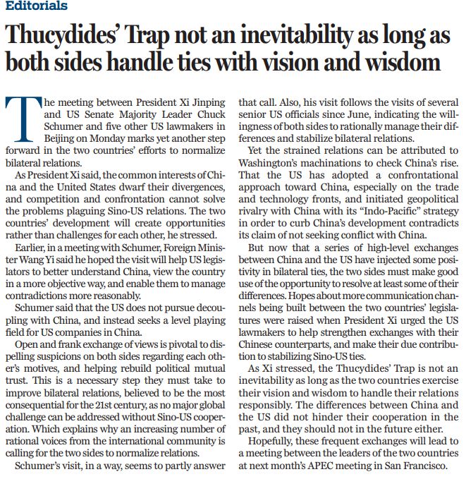 開誠布公地交換意見是消除彼此猜疑、重建政治互信的關(guān)鍵,是雙方為穩(wěn)定和改善雙邊關(guān)系而必須邁出的必要一步。中美關(guān)系是21世紀(jì)最具影響力的雙邊關(guān)系,沒有中美合作,就不可能應(yīng)對(duì)任何重大的全球性挑戰(zhàn)。這也是為什么國際社會(huì)越來越多的理性聲音呼吁雙方實(shí)現(xiàn)關(guān)系正常化。舒默的訪問在某種程度上似乎部分回應(yīng)了這一呼聲。繼 6 月以來多位美國高官訪華之后,美國兩黨議員代表團(tuán)來訪,表明了雙方理性處理分歧、穩(wěn)定雙邊關(guān)系的意愿。
