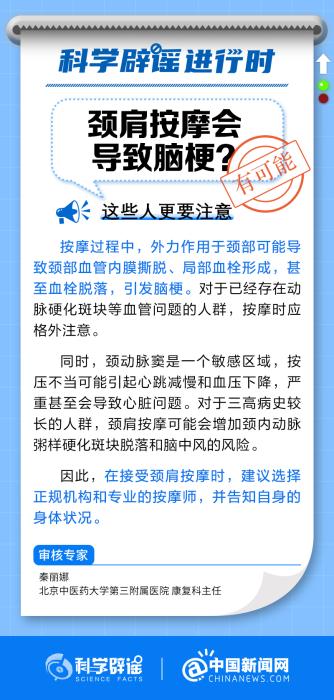 中新網(wǎng)10月12日電 按摩過程中,外力作用于頸部可能導(dǎo)致頸部血管內(nèi)膜撕脫、局部血栓形成,甚至血栓脫落,引發(fā)腦梗。在接受頸肩按摩時(shí),建議選擇正規(guī)機(jī)構(gòu)和專業(yè)的按摩師,并告知自身的身體狀況。(來源:@科學(xué)辟謠 @中國(guó)新聞網(wǎng) )