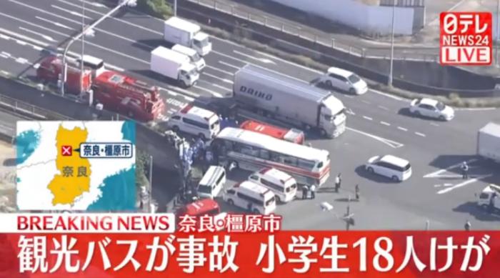 中新網10月18日電 據日本電視臺報道,當地時間18日清晨,日本奈良縣一輛滿載小學生的觀光巴士與另一輛汽車相撞,至少18名小學生受傷。