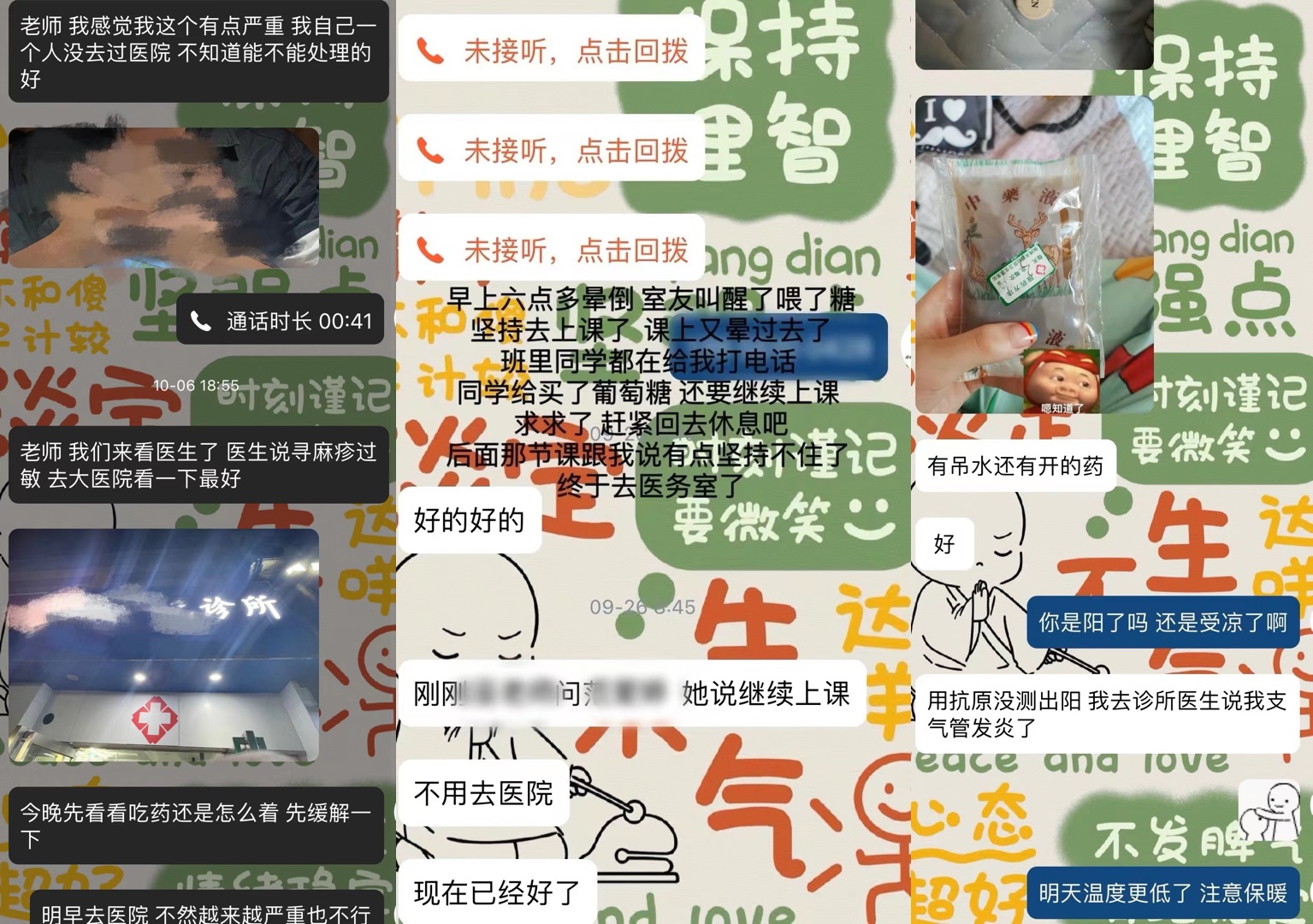 最近就有一個(gè)學(xué)生讓阿宛印象深刻。“有天早上六點(diǎn)多,學(xué)生的室友就給我發(fā)消息說(shuō)她在寢室暈倒了,好像低血糖犯了,后來(lái)說(shuō)已經(jīng)醒了。八點(diǎn)半后,我又接到了班長(zhǎng)的電話,說(shuō)學(xué)生在課上暈過(guò)去了,當(dāng)時(shí)的心情真的是‘表面冷靜處理,內(nèi)心發(fā)出尖銳爆鳴聲’。一天兩次暈倒,真的擔(dān)心孩子出什么事?!?/p>