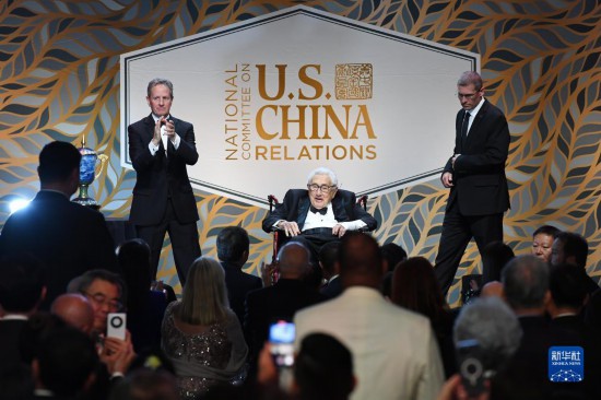 10月24日,美國(guó)前國(guó)務(wù)卿基辛格(中)出席在紐約舉行的美中關(guān)系全國(guó)委員會(huì)年度頒獎(jiǎng)晚宴。新華社記者李睿攝