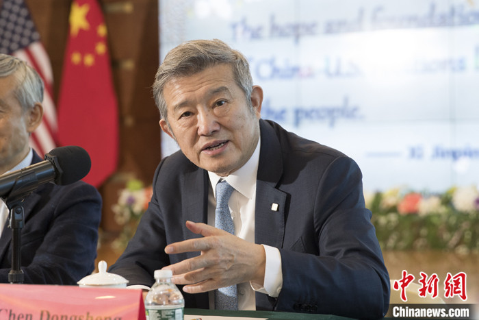 當(dāng)?shù)貢r(shí)間10月25日,參加清華大學(xué)和美中關(guān)系全國(guó)委員會(huì)共同舉辦的“中美民眾對(duì)話”活動(dòng)的部分代表來到中國(guó)駐紐約總領(lǐng)事館,就中美經(jīng)貿(mào)關(guān)系、科研合作、人文交流等回答記者提問。被問及中國(guó)企業(yè)在美國(guó)投資的相關(guān)問題時(shí),泰康保險(xiǎn)集團(tuán)董事長(zhǎng)陳東升表示,貿(mào)易和投資對(duì)中美關(guān)系十分重要。在美國(guó)投資,比如康復(fù)醫(yī)療是一個(gè)大的合作方向,我們歡迎美國(guó)的企業(yè)來合作,這是互利互惠的過程。 中新社記者 廖攀 攝